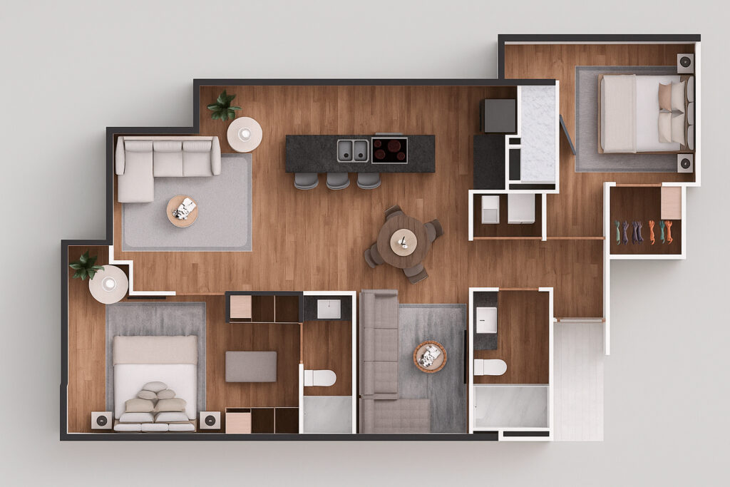 El departamento cuenta con 3 Recámara, 3 Baños y medio, Cocina, Comedor, Sala, Cuarto de lavado y 2 Lugar de estacionamiento (opcional).